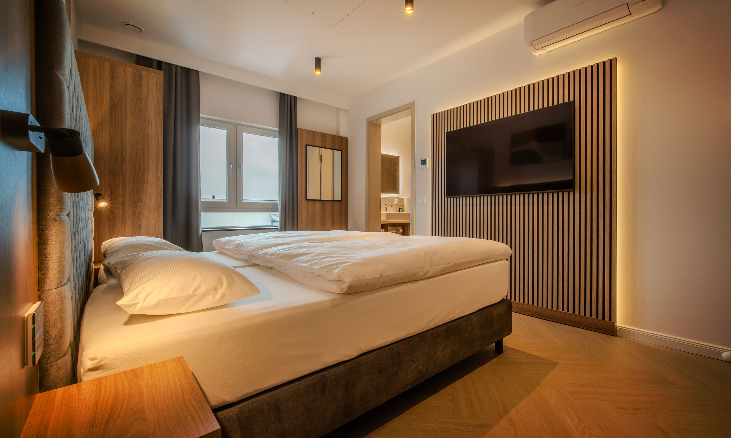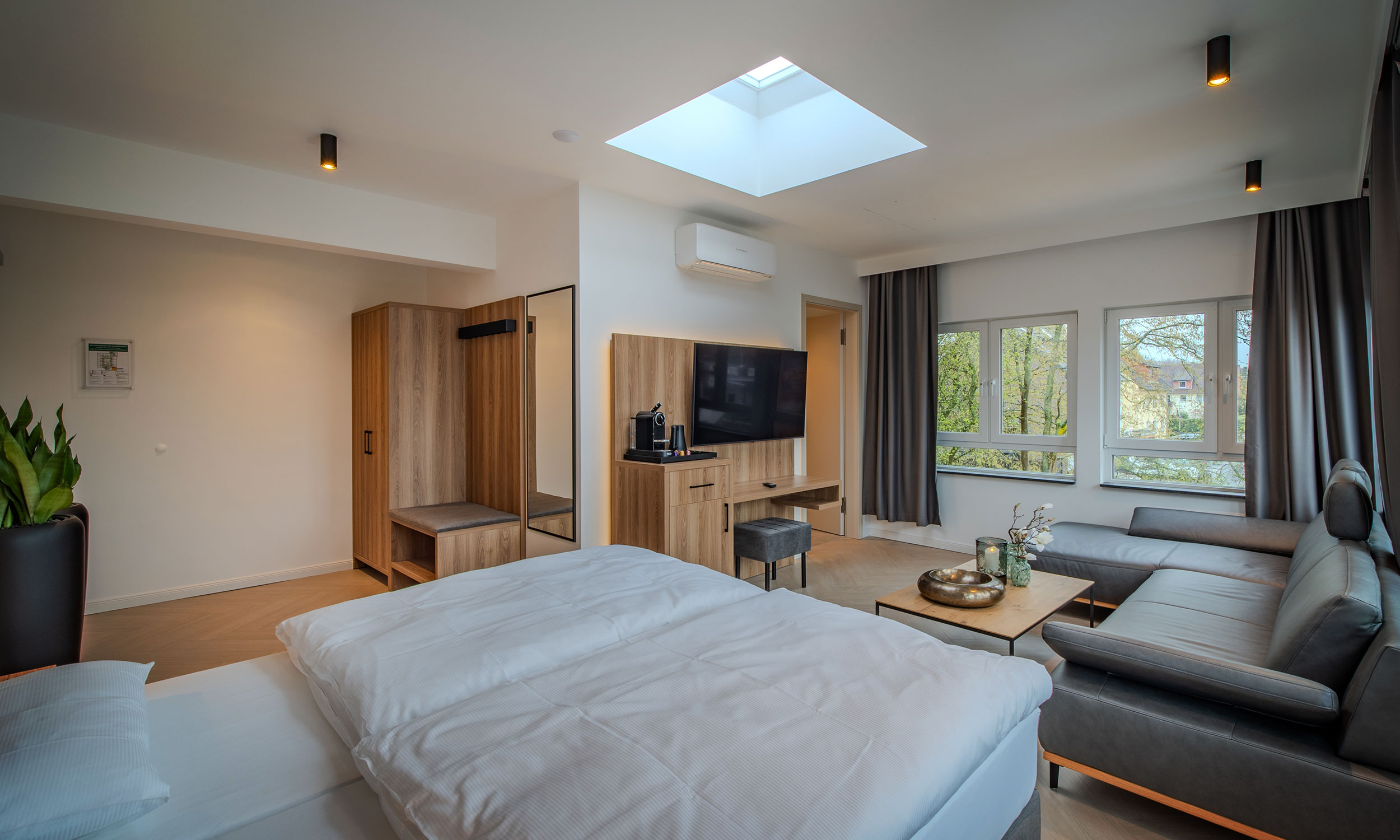 Die stilvoll eingerichteten Zimmer überzeugen durch hochwertige Materialien, warme Farben und ein durchdachtes Raumkonzept. Je nach Kategorie stehen Ihnen Zimmer mit ca. 20 m² oder Suiten mit bis zu 35 m² zur Verfügung – ausgestattet mit komfortablen Betten, eleganten Sitzmöglichkeiten, Schreibtisch, Klimaanlage sowie modernen Badezimmern mit großzügiger Dusche. Große Fenster sorgen für viel Tageslicht und eine angenehme Atmosphäre.
